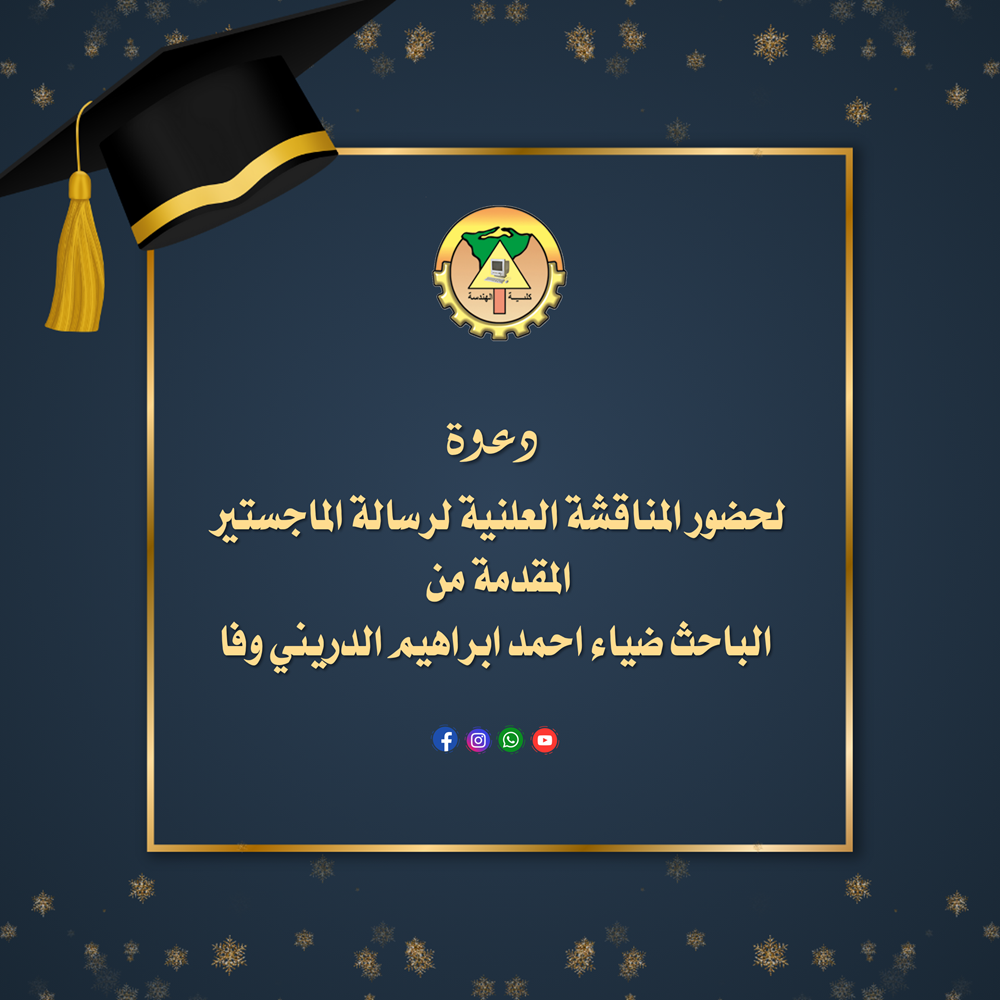 يعلن قطاع الدراسات العليا والبحوث بكلية الهندسة جامعة طنطا وقسم هندسة الأشغال العامة بالكلية عن موعد انعقاد المناقشة العلنية الخاصة برسالة الماجستير المقدمة من الباحث ضياء احمد ابراهيم الدريني