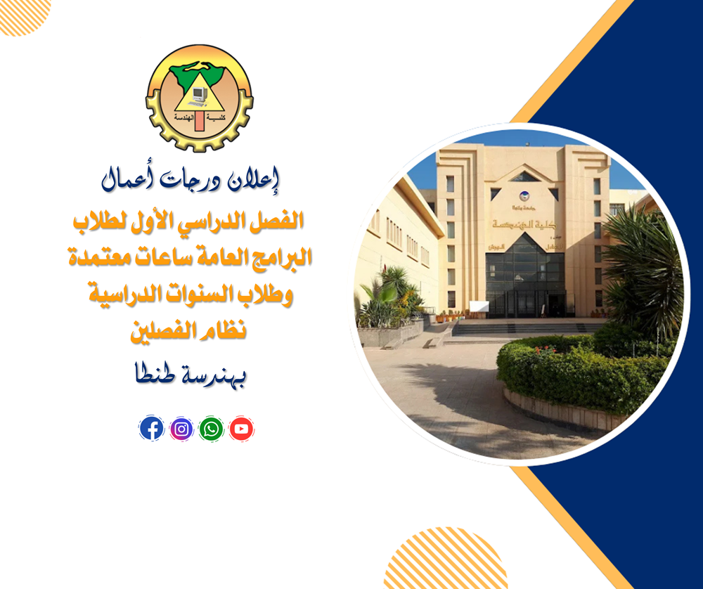 تعلن كلية الهندسة جامعة طنطا درجات أعمال الفصل الدراسي الأول للعام الجامعي ٢٠٢٥-٢٠٢٦، وذلك لطلاب البرامج العامة ساعات معتمدة وطلاب السنوات الدراسية نظام الفصلين