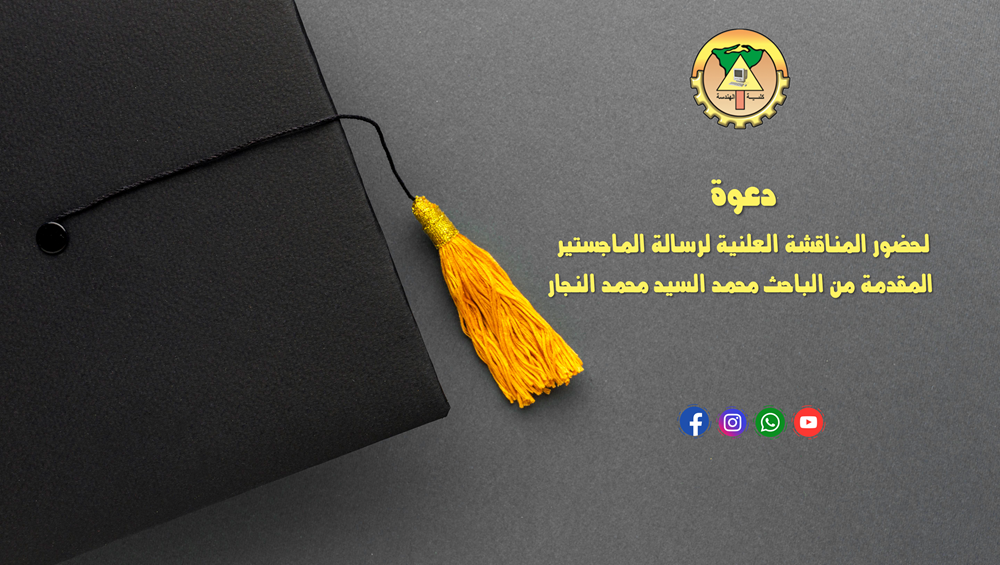 يعلن قطاع الدراسات العليا والبحوث بكلية الهندسة جامعة طنطا وقسم هندسة الإنتاج والتصميم الميكانيكي بالكلية عن موعد انعقاد المناقشة العلنية الخاصة برسالة الماجستير المقدمة من الباحث محمد السيد محمد النجار-