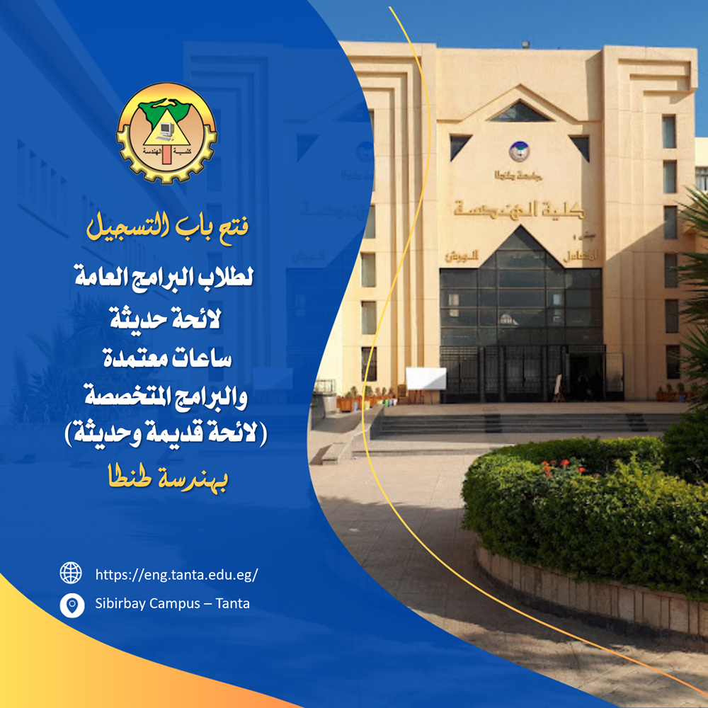 تعلن كلية الهندسة جامعة طنطا عن فتح باب التسجيل لطلاب البرامج العامة لائحة حديثة ساعات معتمدة والبرامج المتخصصة-المميزة (لائحة قديمة وحديثة) من يوم ١٤ فبراير2026 وحتى 5 مارس 2026،