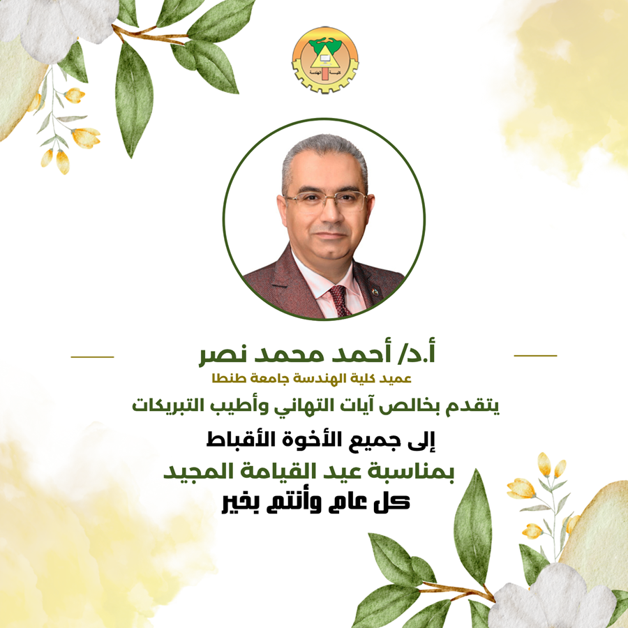 يتقدم الأستاذ الدكتور أحمد محمد نصر عميد هندسة طنطا بخالص التهنئة للأخوة الأقباط من أعضاء هيئة التدريس والهيئة المعاونة والعاملين بالجامعة و