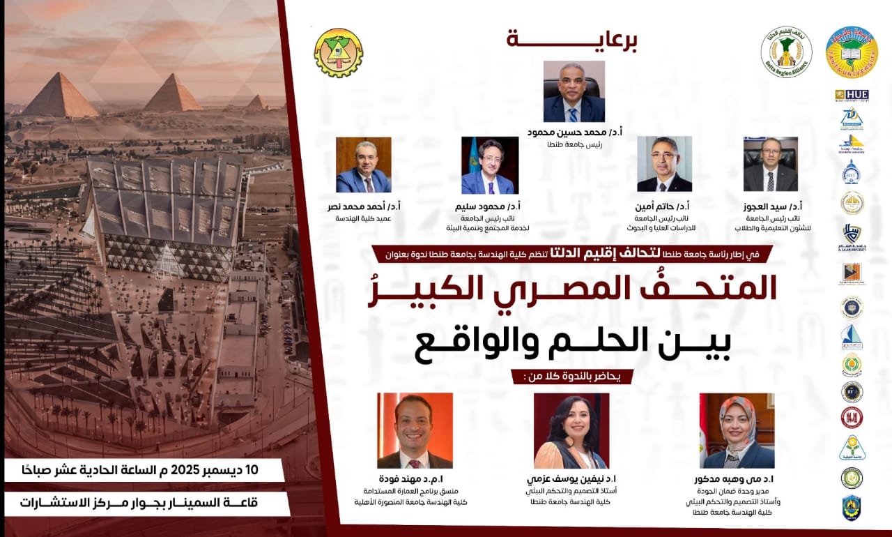 Faculty of Engineering at Tanta University announces organizing a scientific symposium titled “The Grand Egyptian Museum: Between Dream and Reality” on Wednesday, December 10th, 2025. The event coincides with the celebrations of the Arab Republic of Egypt marking the inauguration of the Grand Egyptian Museum. It is also part of the action plan of the university during its presidency of the Delta Universities Regi