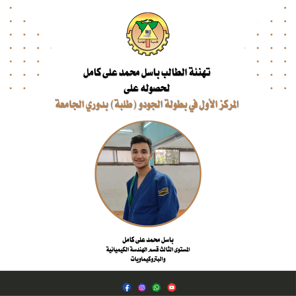 Prof. Ahmed Nasr, Dean of Faculty of Engineering; vice deans; academic staff; assistant staff; employees; and students extend their sincere congratulations to the student/ Basel Mohammed Ali Kamel, registered in level three in Chemical and Petrochemical Engineering, on gaining the top rank in Gudo at the u